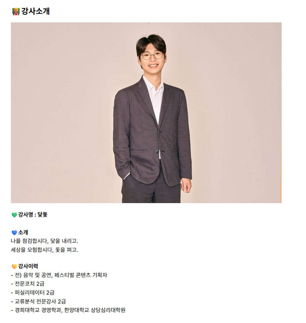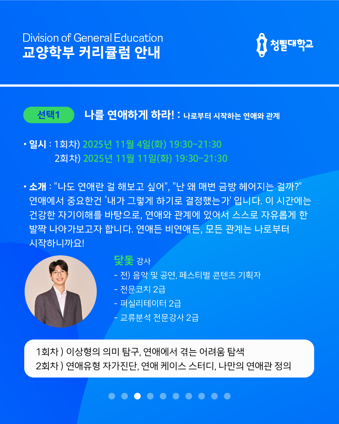 | 선택-5 | 나와 우리, 건강한 관계를 위한 용기 | 우리는 살아가면서 타인의 기대와 시선을 의식하며 살아갑니다. 때로는 인정받지 못한다는 두려움에, 스스로의 마음을 미뤄두기도 합니다. 이 강의는 그런 불안에서 벗어나 나 자신을 이해하고 존중하는 방법을 함께 배우는 시간입니다 | 11월 18일(화) 19:30~21:30 |