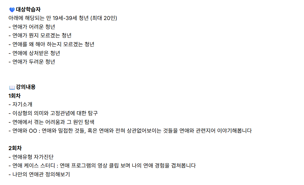 | 선택-2 | 나를 연애하게 하라! -나로부터 시작하는 연애와 관계 | 연애가 어렵거나, 연애를 왜 해야 하는지 모르겠거나, 연애가 싫은 청년들이 서로 묻고 답하는 연애 이야기 | 1회차 : 11월 4일(화) 19:30~21:30 2회차 : 11월 11일(화) 19:30~21:30 |
