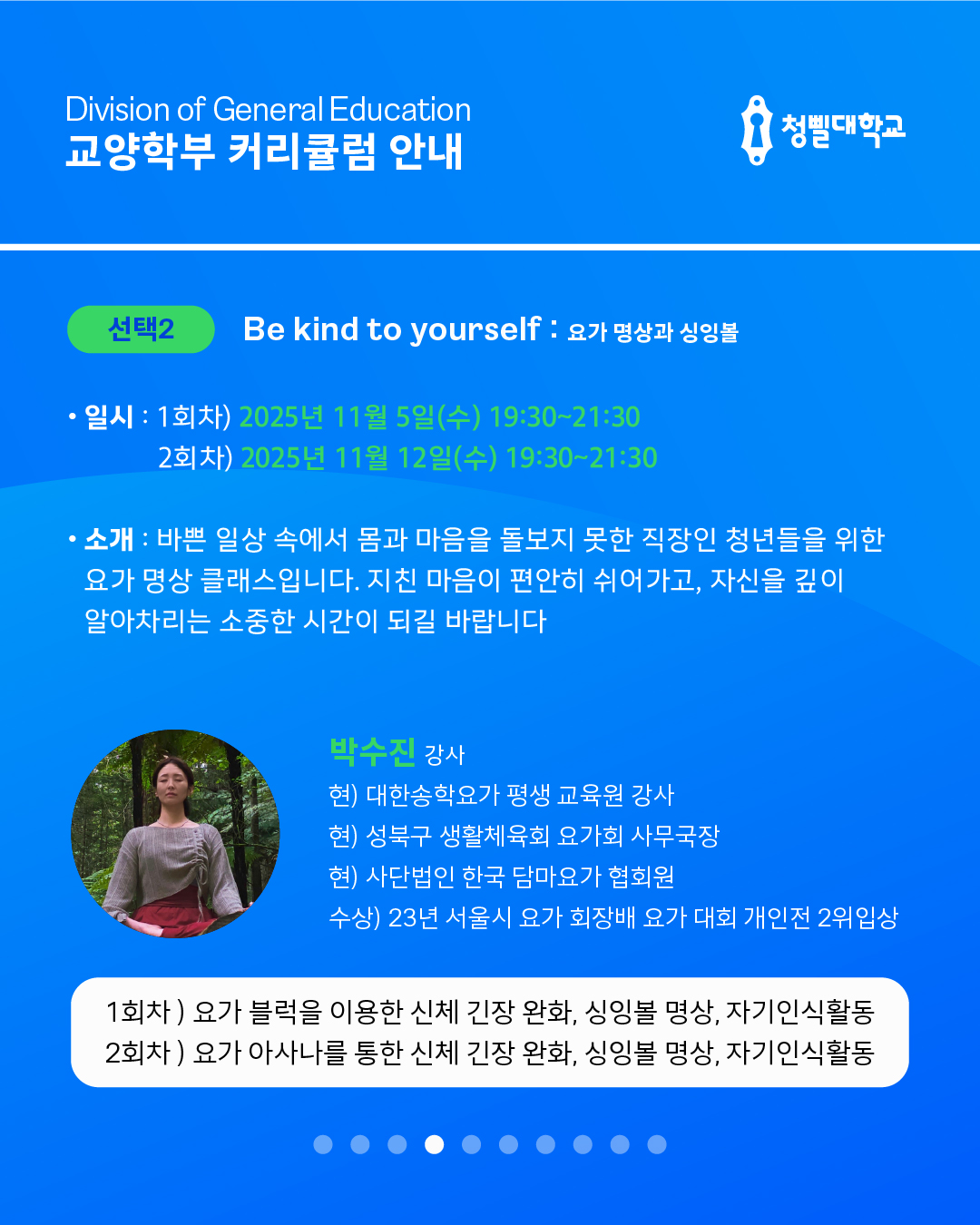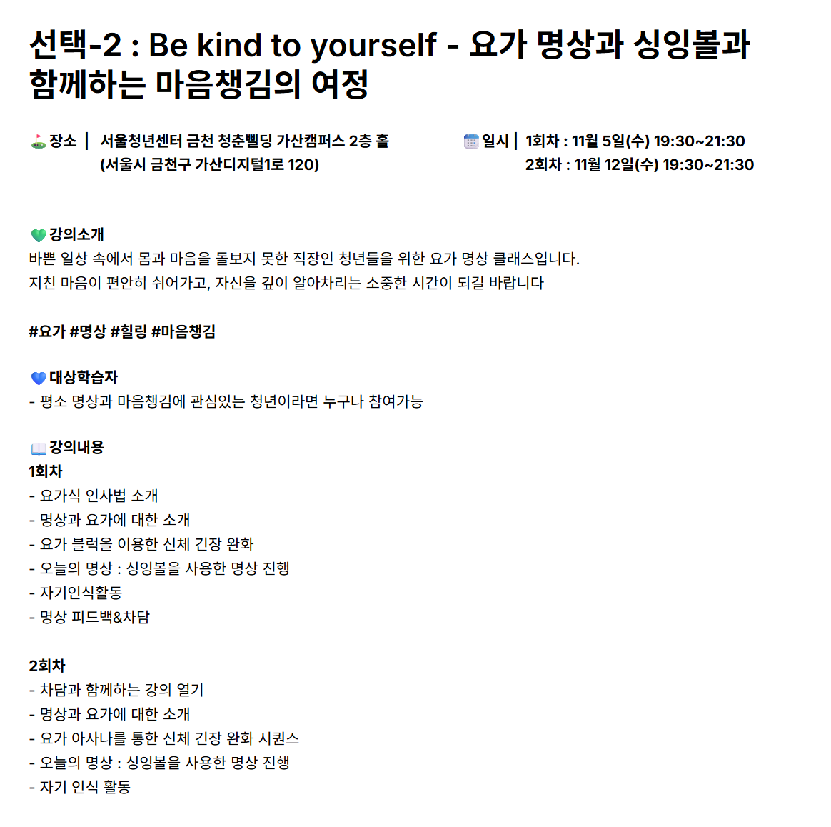 | 선택-3 | Be kind to yourself | 바쁜 일상 속에서 몸과 마음을 돌보지 못한 직장인 청년들을 위한 요가 명상 클래스입니다. 지친 마음이 편안히 쉬어가고, 자신을 깊이 알아차리는 소중한 시간이 되길 바랍니다 | 1회차 : 11월 5일(수) 19:30~21:30 2회차 : 11월 12일(수) 19:30~21:30 |